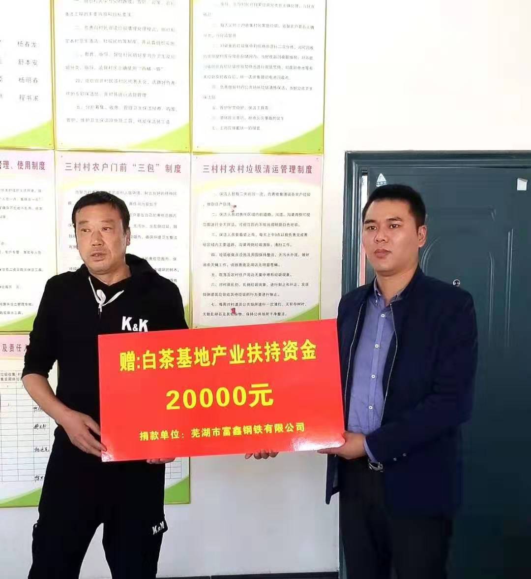蕪湖市富鑫鋼鐵有限公司黨委、工委積極響應(yīng)上級(jí)黨委號(hào)召,2019年11月7日下午在經(jīng)信局黨組書(shū)記、局長(zhǎng)包小明同志帶領(lǐng)下一行6人,驅(qū)車(chē)趕往太湖縣北中鎮(zhèn)三村村開(kāi)展結(jié)對(duì)扶貧工作。扶貧期間,公司先后對(duì)三村村委、和北中鎮(zhèn)白茶基地兩個(gè)單位進(jìn)行了資金幫扶。此次參與扶貧下鄉(xiāng)活動(dòng),是公司黨委將“不忘初心、牢記使命”主題教育的學(xué)習(xí)成果轉(zhuǎn)化為實(shí)際行動(dòng),踐行公司董事長(zhǎng)提出的用誠(chéng)信打造企業(yè)、用真心回報(bào)社會(huì)的總要求。